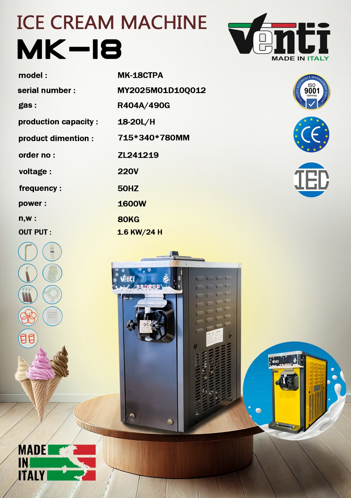 دستگاه بستنی قیفی رومیزی Venti MK-18 یک مدل حرفهای با تک نازل (تک قیف) و تک مخزن و تک فاز و سیستم پمپی است که بهراحتی در فضاهای کوچک نصب میشود. این دستگاه با بهرهگیری از تکنولوژی روز دنیا، امکان تولید بستنی تکرنگ، دورنگ و حتی بستنی با تکههای میوه را فراهم میکند.