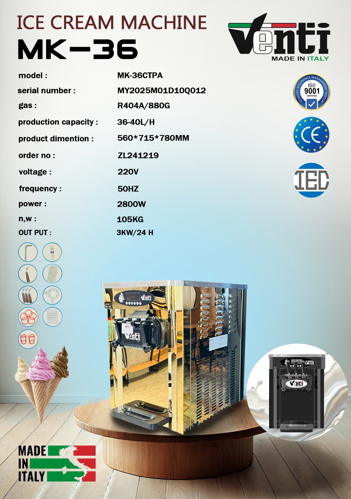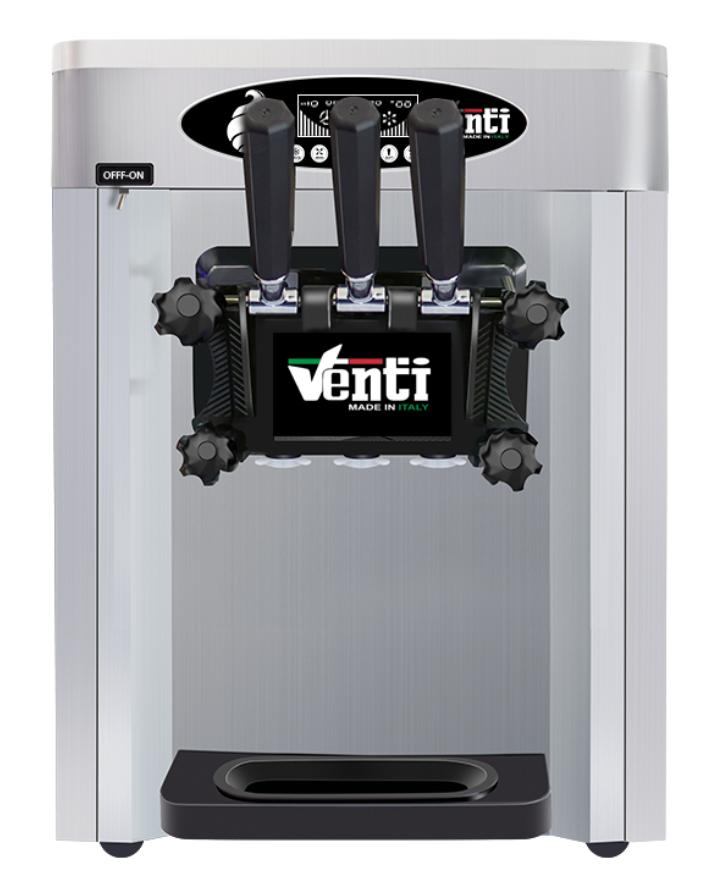 دستگاه بستنی قیفی رومیزی Venti MK-36 یک مدل حرفهای با سه نازل (سه قیف)، دو مخزن مجزا و سیستم پمپی است که بهراحتی در فضاهای کوچک نصب میشود. این دستگاه با بهرهگیری از تکنولوژی روز دنیا، امکان تولید بستنی تکرنگ، دورنگ و حتی بستنی با تکههای میوه را فراهم میکند.